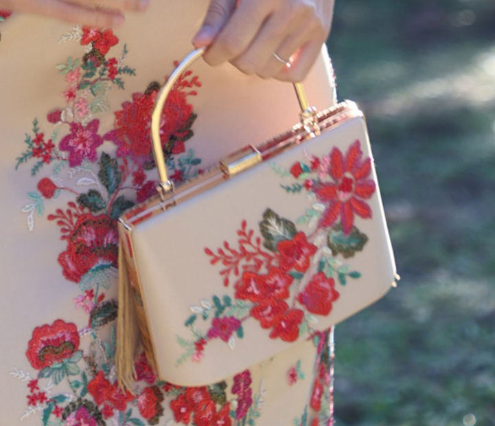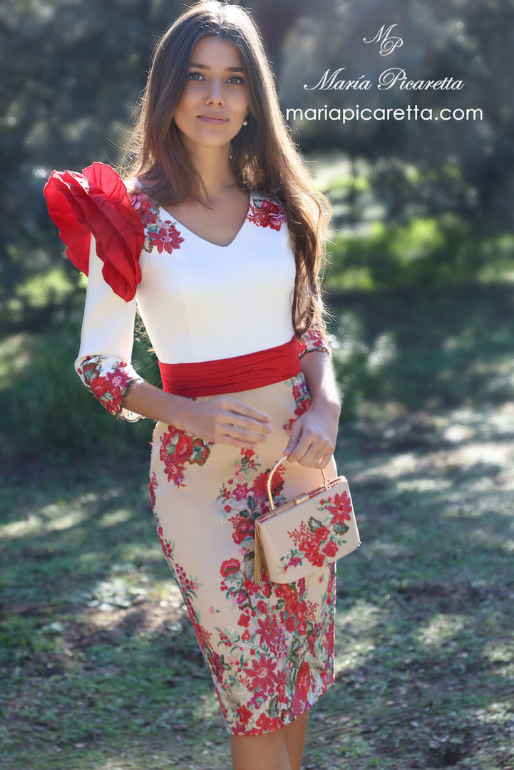 El modelo Mariella de Maria Picaretta es un vestido elegante, midi entallado con cuerpo en crep mate blanco y falda en tul bordado con hilo lurex en tonos beige, rojos y verdes. El diseño presenta un cuello en pico, mangas tres cuartos con aplicaciones de flores rojas bordadas a mano en los puños y un llamativo volante rojo en la manga izquierda. Se complementa con un cinturón rojo a la cintura que define la silueta. El bolso a juego, con el mismo estampado floral, finaliza el look. Un vestido perfecto para eventos especiales, con un toque de romanticismo y sofisticación. Ideal para Mamás de Comunión o Mamás de Bautizo