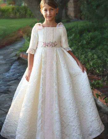 Vestido de Comunion LUCIA, elegancia y dulzura en cada detalle. Confeccionado en jacquard brocado de delicado relieve floral, este diseño se realza con tul bordado y románticas aplicaciones de puntilla de guipur.